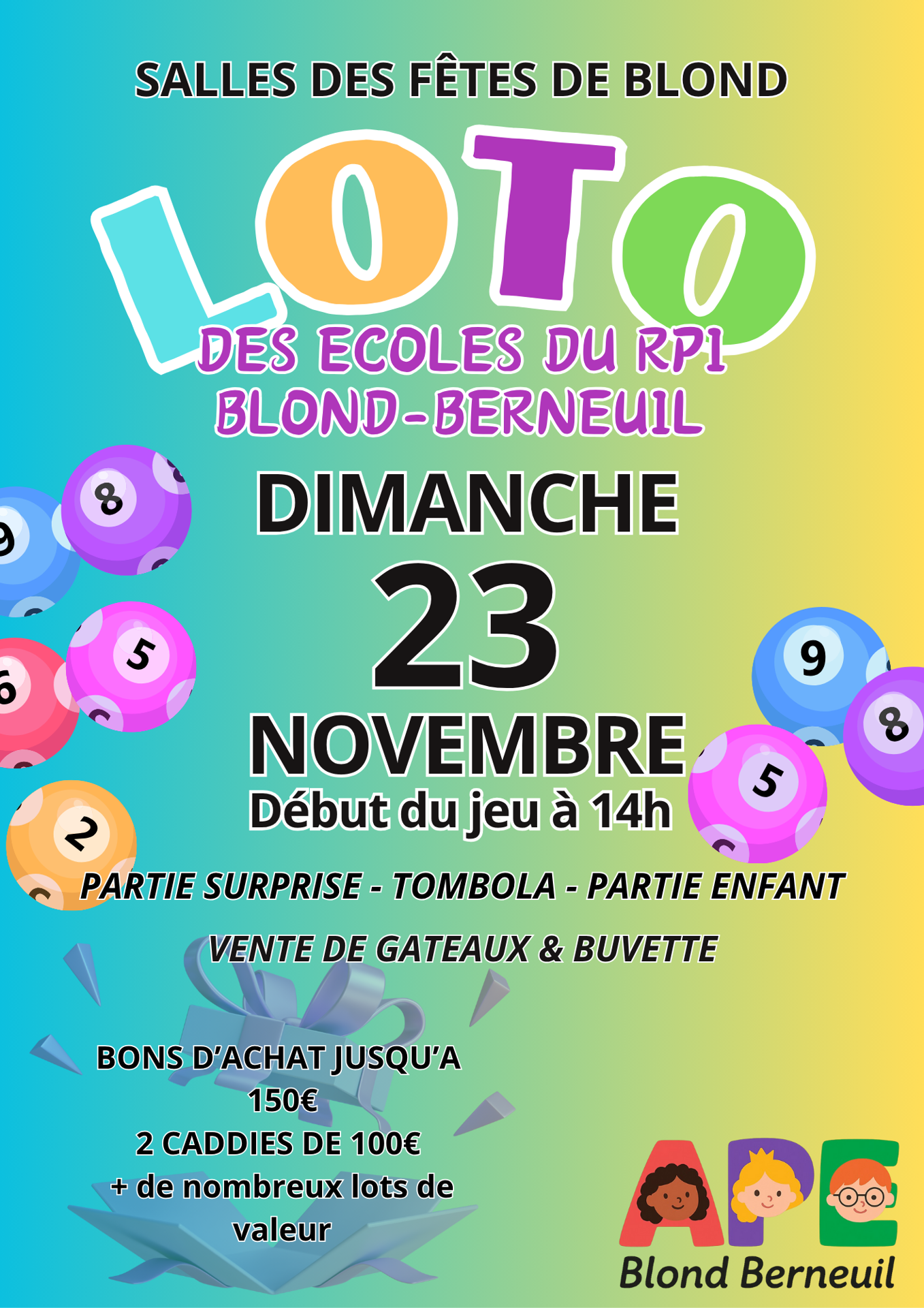 L'Association des Parents d'Elèves du RPI BLOND-BERNEUIL organise un LOTO le 23 novembre à 14 h 00, de nombreux lots sont à gagner, avec une partie surprise, partie enfant et tombola.